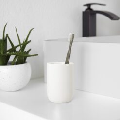 Pohár JUNIP biely matný od spoločnosti Umbra je vyrobený zo živice, je hladký na dotyk a ľahko sa čistí.