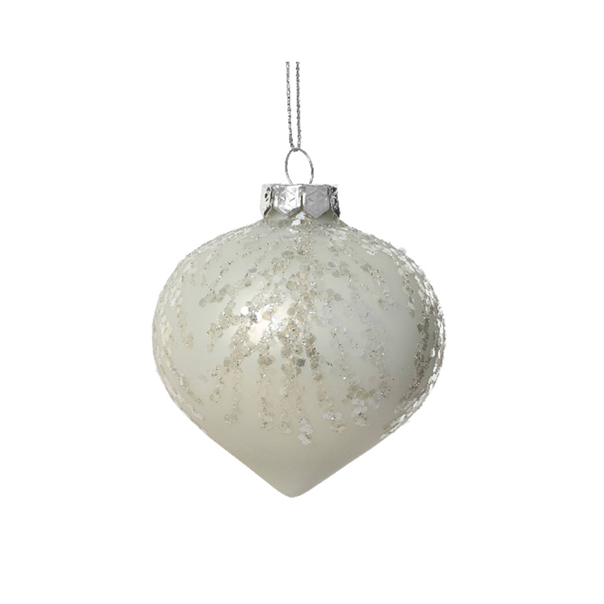 Sklenená vianočná guľa – FROST – cibuľovitá – biela 8 cm