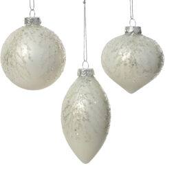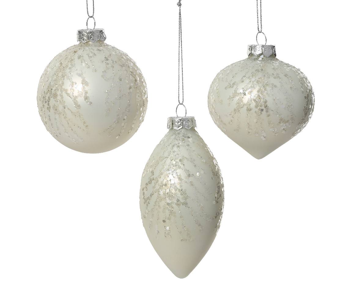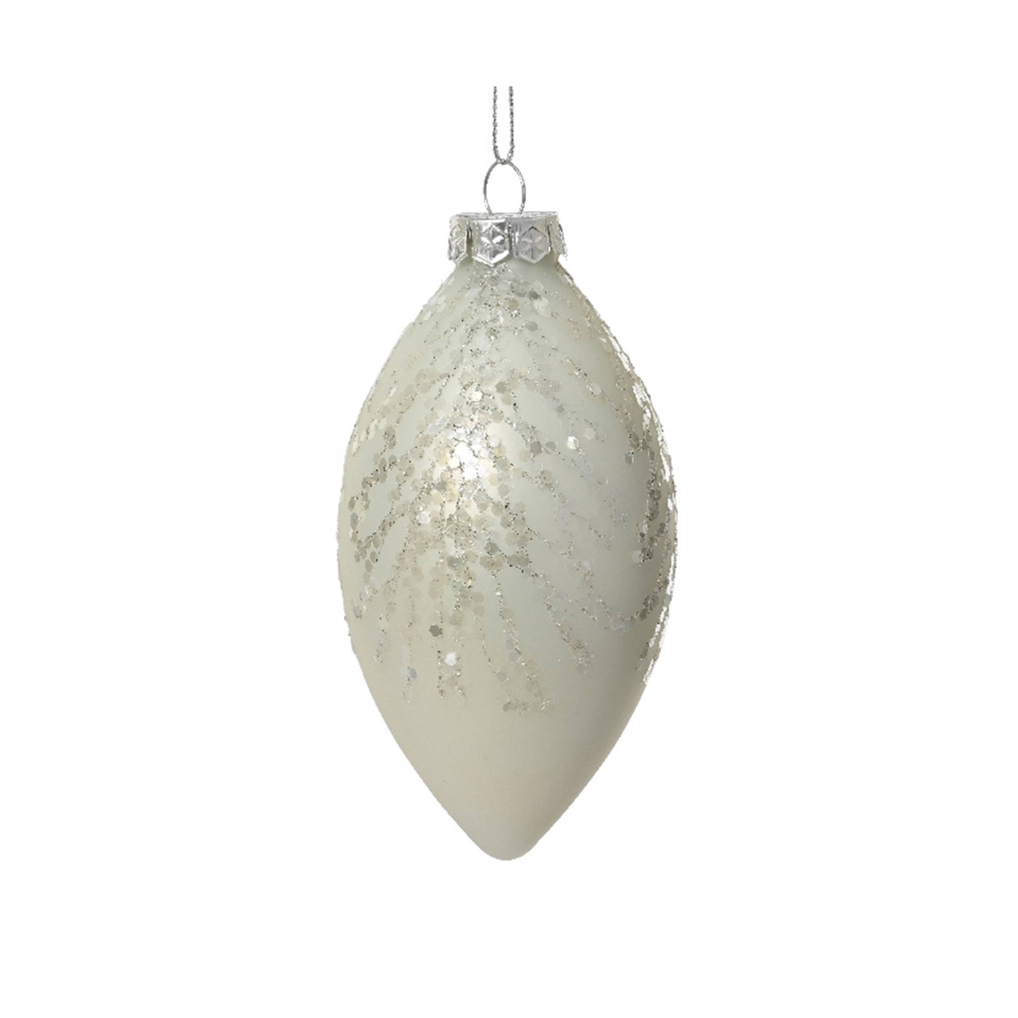 Sklenená vianočná guľa – FROST – podlhovastá – biela 8 cm