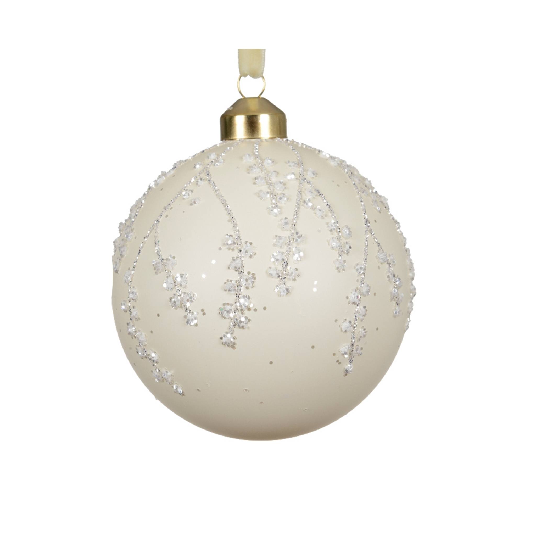 Sklenená vianočná guľa – matná biela so zdobením – 10 cm