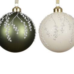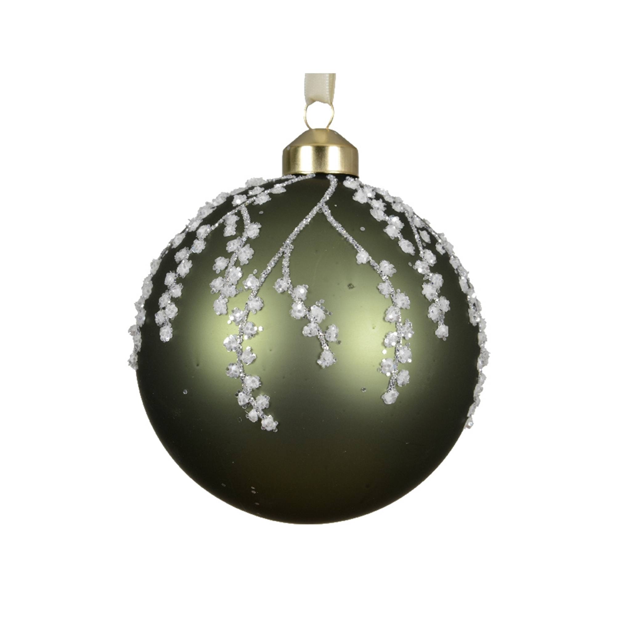 Sklenená vianočná guľa – matná tmavozelená so zdobením – 10 cm