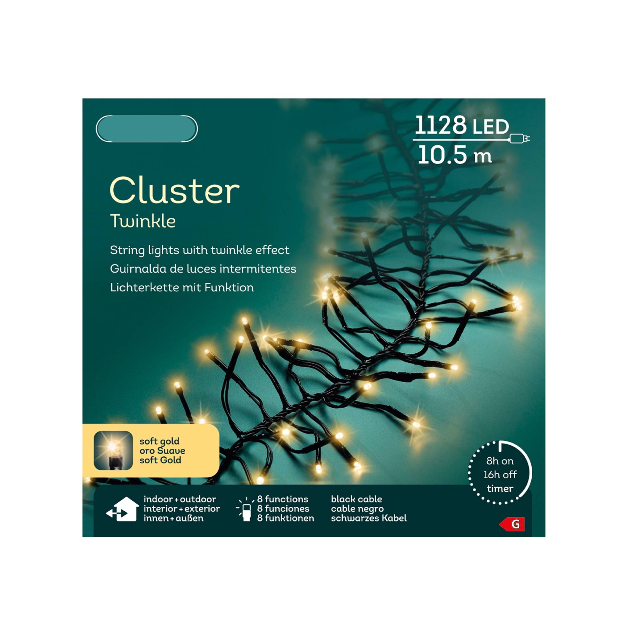 Svetelná reťaz 10,5 m – strapcová – 8 funkcií – 1128 LED soft gold – čierny kábel