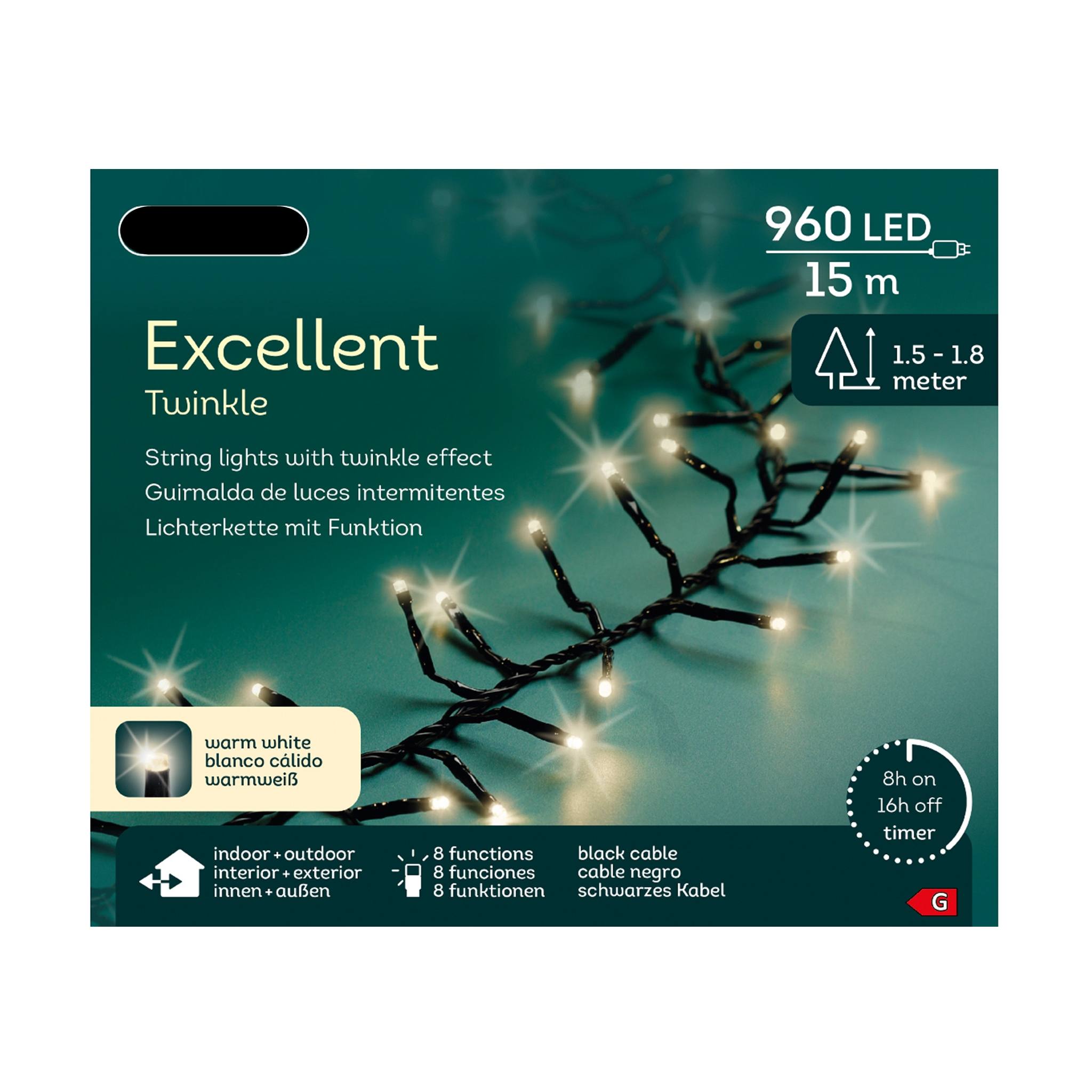 Svetelná reťaz 15 m – 8 funkcií – 960 LED warm white – čierny kábel