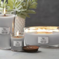 Woodwick vonná sviečka s arómou Lavender & Cedar.